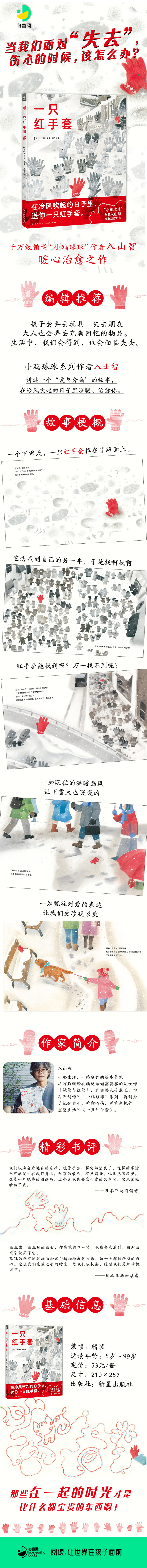 《一只红手套》是累计销量超一千万册的“小鸡球球”系列作者入山智的最新作品。他擅长运用清淡柔和的粉蜡笔和彩铅,营造出纤细温暖的绘本画面,这一风格在这部作品中亦有明显体现。