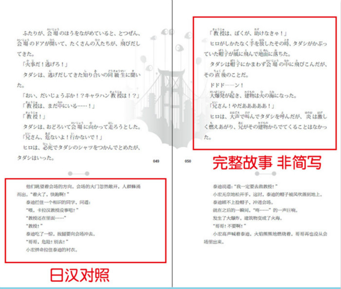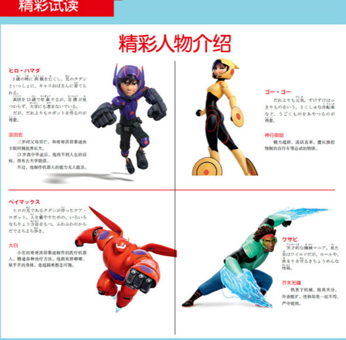 《 迪士尼大电影双语阅读·超能陆战队(日汉对照)》本书是迪士尼电影小说,日汉对照,适合初级以上日语水平的读者。 故事简介如下:在未来世界的超级都市,热爱发明创造的天才少年小宏,在哥哥的鼓励下参加了理工学院的机器人大赛。他凭借微型机器人赢得一致好评,谁知突如其来的灾难夺走了小宏的哥哥,也将小宏的梦想和人生毁于一旦。小宏的身心饱受创伤,哥哥生前留下的治疗型机器人大白则成为安慰他的伙伴。之后小宏意外发现那场灾难背后似有阴谋,于是他和大白以及哥哥的朋友们共同努力,和神秘人展开了较量……