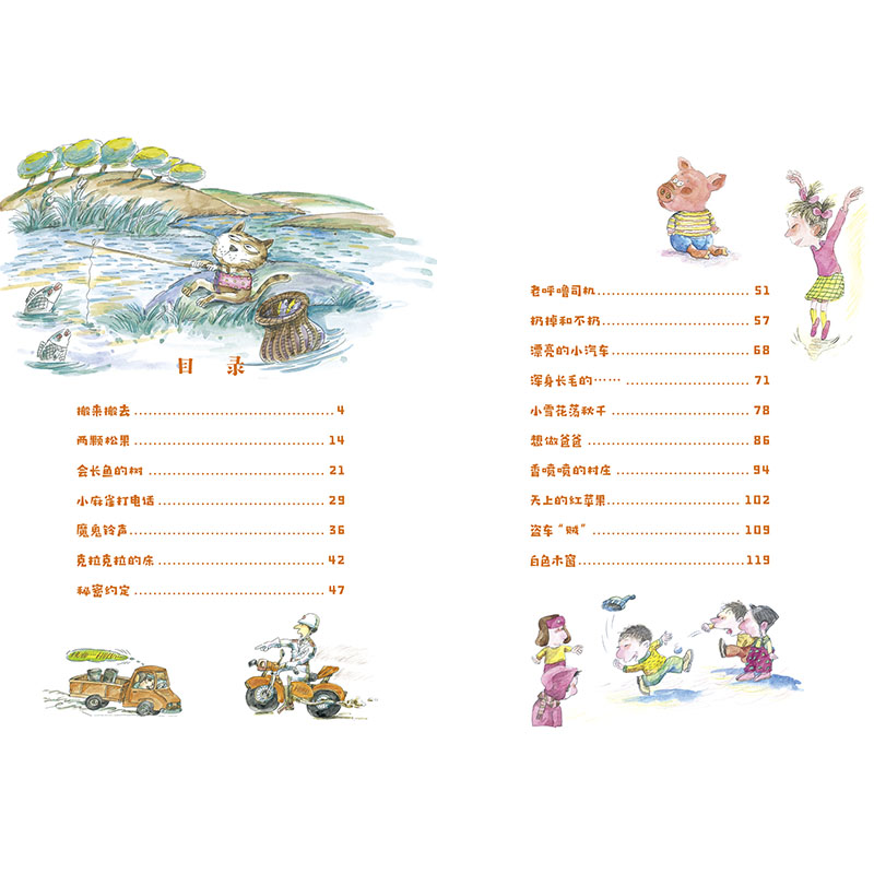 不会钓鱼的小猫咪咪发现了一棵会长鱼的树,他*终吃到树上的鱼了吗?小象克拉克拉的爸爸给克拉克拉做了一张大床,许多小动物都想睡这张床,他们能挤得下吗?一个小偷撬开了一家没有主人的房子,一阵铃声响起,一直跟在他的身后,还窜进了耳朵里,*后小偷甩掉魔鬼铃声了吗?一辆出租车被盗了,盗车贼居然是一只老熊。老熊把车开到了医院门口,下一步他要做什么呢……