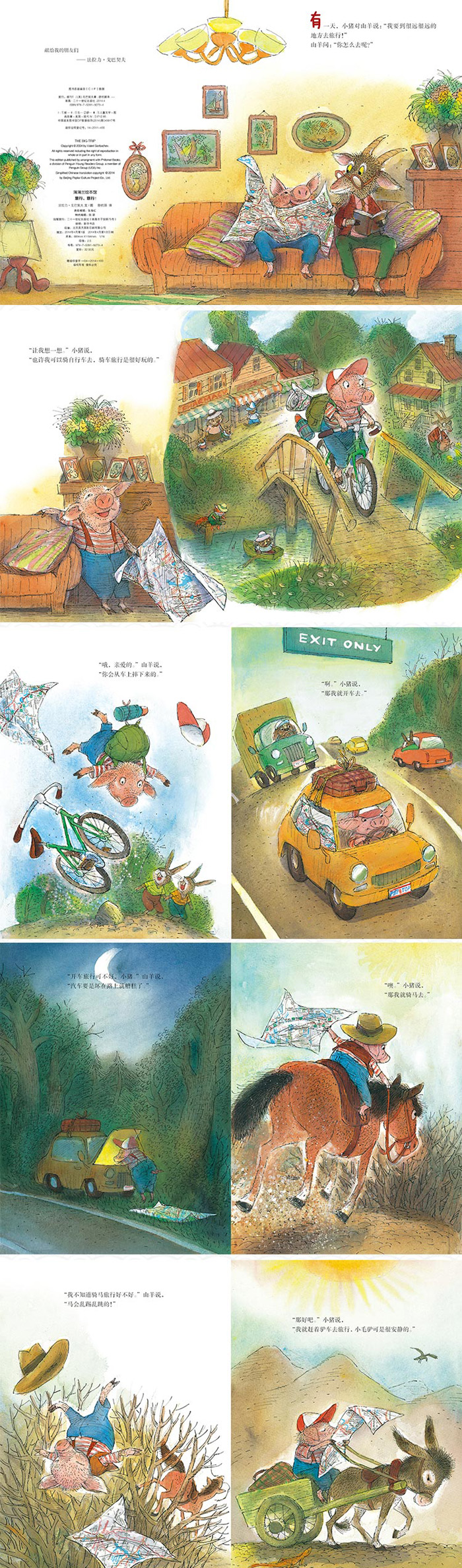 骑车会要摔下来, 开车会停在旅途上, 骑马会要掉下来, 驴车一步都走不了, 坐火车会卡在隧道里, 坐飞机和热气球得要跳伞去逃命, 坐轮船的麻烦更是数不清! 一只小猪出门旅行是非常可怕的事情。除非是...... 带你的朋友一块儿去。