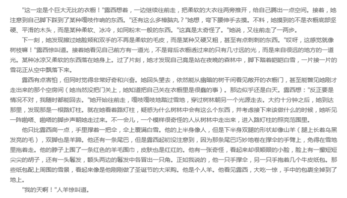 本书讲述了佩文西家四个兄弟姐妹误闯魔法王国,经历探险和奇遇的故事。彼得、苏珊、埃德蒙和露西在一位老教授家做客,无意中发现衣橱后隐藏着一个神奇的魔法王国。这里的居民有羊人、海狸、矮人、树精……但在阿斯兰离开纳尼亚期间,这个国家被一个邪恶的白女巫占领。她压迫纳尼亚的居民,将其置于永恒的冬季之中。羊人图姆纳斯曾冒着生命危险救过露西,海狸一家也帮助他们兄妹逃脱白女巫的追杀。埃德蒙曾受白女巫土耳其软糖的诱惑,一度背叛过自己的兄妹。后来,阿斯兰伴随着圣诞老人来到纳尼亚,带领大家战胜了女巫。四个孩子成为纳尼亚的国王与女王。多年后,他们在打猎时无意中穿过衣橱,重新以孩子的身份回到自己的世界。