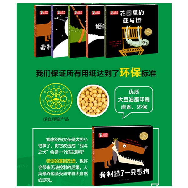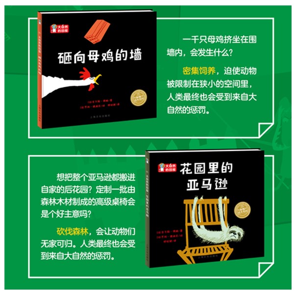 本书是一套“环保主题”科普绘本。通过发生在人类和动物之间的略带讽刺意味的幽默小故事,让读者知道人类的一些不友友善行为会给大自然带来伤害,而人类*终也会受到来自大自然的惩罚。《大自然的回报》(全5册)讲述了五个小故事,分别是:《我养了一条鳄鱼》《我制造了一只恶狗》《冬天的草莓》《花园里的亚马逊》《砸向母鸡的墙》,有别于常见、传统的环保话题,以上五册图书分别对应了“滥杀野生动物、错误的基因改造、消费反季节水果、砍伐森林、密集饲养”这五大普通大众十分关注却又不了解的环保主题。这些问题发生在我们的身边,关系着我们每个人的日常生活。本套图书能够给3-6岁的孩子和他们的家长解释这些问题,引发思考,传递环保的价值理念,引导人们热爱大自然,与大自然和谐相处。