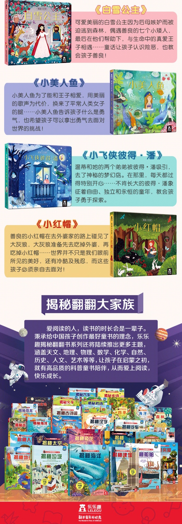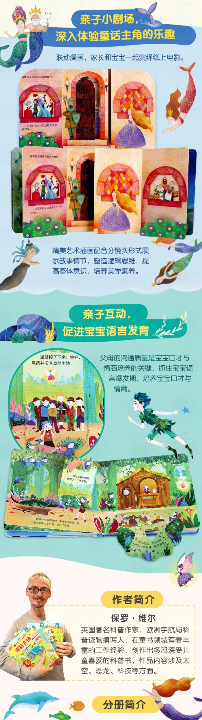 乐乐趣“揭秘小世界”系列是专为低幼儿童创作的“童眼看世界”认知绘本,旨在让孩子通过各种各样的创意“洞洞”和“翻翻”,阅读经典、认识世界。此系列包含《小飞侠彼得·潘》《白雪公主》《小美人鱼》《小红帽》。经典童话故事、丰富内容和童趣插画,搭配孩子喜闻乐见的立体互动形式,充分激发和满足孩子的好奇心,锻炼孩子的手部精细动作,让孩子在戳洞洞、抠翻翻的游戏中阅读经典!简介:小美人鱼为了能和王子相爱,用美丽的歌声为代价,换来了平常人类女子的腿。小美人鱼告诉孩子什么是勇气,也希望孩子可以拿出勇气面对世界的挑战!保罗·维尔,英国著名科普作家,在童书领域有着丰富的工作经验,创作出多部深受儿童喜爱的科普书,作品内容涉及太空、恐龙、科技等方面。