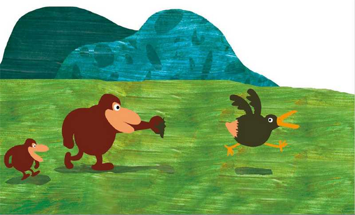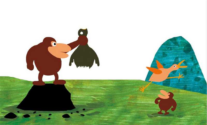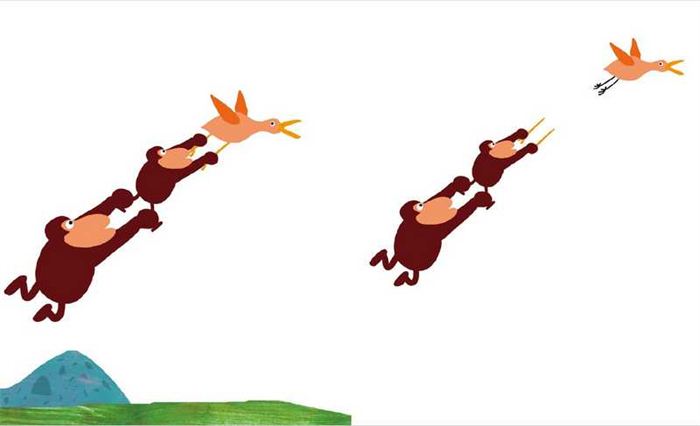 书中没有一个字,内容却生动幽默。大小两只猩猩和一只鸟,两只猩猩每一次都抓到了鸟,每一次鸟都出其不意地逃脱,脑洞大开,让阅读者迫不及待地想去看下一个情节,画面如一台快乐的大戏。简约而不简单,充分展现了图画书的妙处。