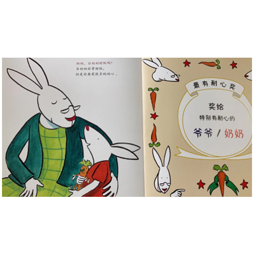 ■畅销800万人气绘本《小熊和好的爸爸》作者全新力作! ▲作者结合亲身带娃经历,聚焦真情实感的隔辈亲、祖孙情; 祖父母科学带娃的实操“技术指导”系列绘本; ◆真实、温馨的祖孙日常,还原家庭生活的情景小品; ★送给孩子和孩子童年亲密的挚友——所有的祖父祖母们! 如果你和祖父母生活在一起,可以这样玩! 第1步:选择角色! 兔姥爷还是兔姥姥?露丝还是布拉姆? 第2步:选择剧情! 选择你和祖父祖母喜欢的那个故事。 第3步:台词排练! 和祖父祖母一起阅读,你一句我一句,完成对话。 第4步:开始表演! 把小兔子们和兔姥爷兔姥姥做的事情一起做一遍吧! (别忘了跟爸爸妈妈一起,为你的兔姥爷/兔姥姥献上一份奖状哦!) 如果你没有和祖父母生活在一起的话…… 这是一套让孩子告别陌生感的祖孙共读破冰神器! 看看小兔子们是如何和祖父母相处的? 祖父母们可以是ZUI亲近的好朋友!