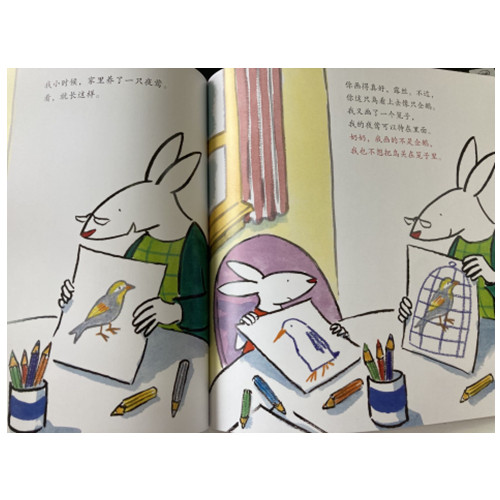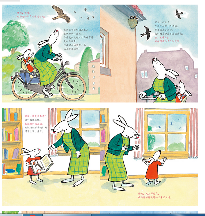 露丝和奶奶一起到公园里玩,她们遇到了有漂亮羽毛的鸽子,长的像鸭子一样的鸳鸯,会唱歌的布谷鸟、燕雀,屋檐下的小燕子......,露丝想邀请一只小鸟来自己家,和奶奶一起做了一个鸟笼,等着小鸟来安家,她们等到小鸟来安家了吗?