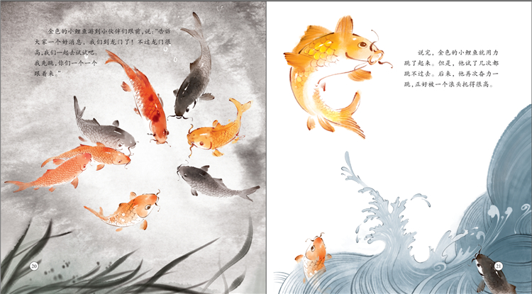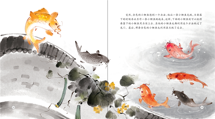 《鲤鱼跳龙门》典故出自《元丰九域志》。古代传说黄河鲤鱼跳过龙门就会变成龙,后来用作比喻逆流前进、奋发向上。
