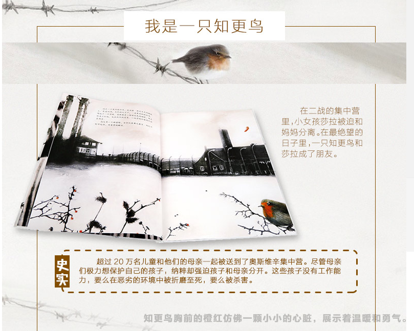 仅仅认识战争与灾难不是目的,目的是在这种认知的基础上,激发他们对人性丑恶面的反思,也激发他们对美好的渴望、对他人的善良。这也是这本书为什么突出知更鸟的视角——知更鸟看到了集中营的绝望,它却尽自己的微薄之力,给小女孩莎拉带来一丝安慰、一丝温暖,正如它红色的胸脯给黑白的背景增添了一抹亮色。但愿透过这本书,这一丝温暖也可以留在孩子心中。
