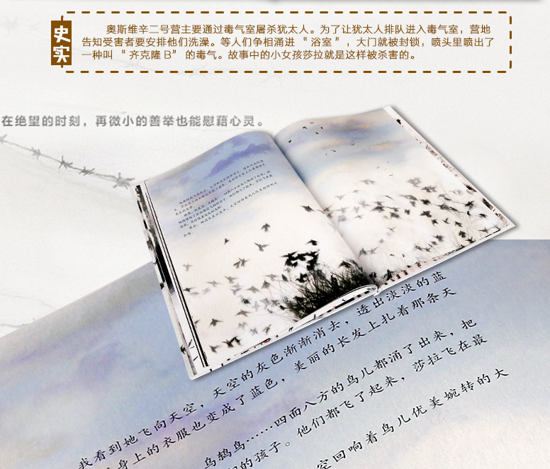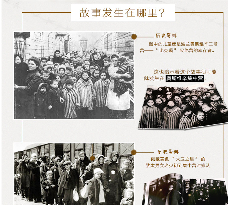 书里的文字并没有指明故事发生的具体地点,但透过一块标着“止步!”的警示牌,我们可以猜到故事的背景很可能是奥斯维辛集中营。纳粹在奥斯维辛的二号营建有毒气室,营地往往以组织洗澡为由,诱骗犹太人进入毒气室,然后喷射一种叫做“齐克隆B”的毒气。故事中的莎拉和其他犹太孩子就是在毒气室遇难的。在那个黑暗的时代,大约96万犹太人在奥斯维辛二号营遇难——除了在毒气室被杀害,还有的人死于疾病、饥饿、生物学实验等。