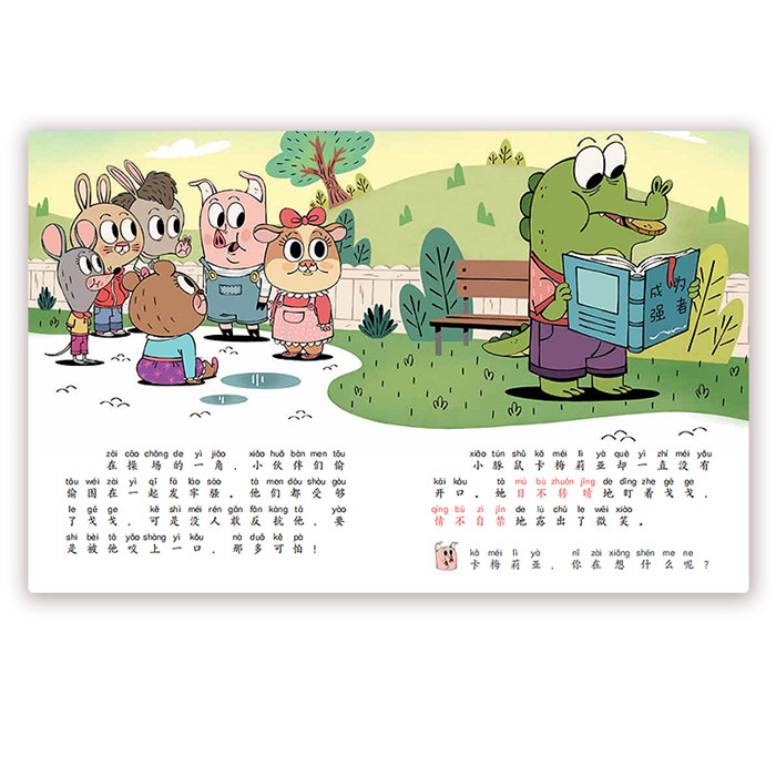 小霸王鳄鱼戈戈在操场上到处欺负别人,小伙伴们都不敢反抗,因为戈戈长着一口锋利的牙齿。只有小豚鼠卡梅莉亚一点儿也不怕他,恰恰相反……