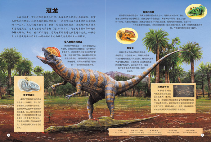 让我们来看一下色彩绚烂的鸟儿们吧,孔雀尾巴上的羽毛五彩缤纷,巨嘴鸟的喙色彩艳丽,知更鸟的胸脯红艳艳的——色彩是鸟类之间互相交流的一种方式。鸟儿们的大脑可以“解读”看到的颜色,并能够辨别其他鸟类是敌还是友。鸟类与恐龙关系密切,与恐龙有着相似的大脑和镰状结构。由此,我们可以猜想,恐龙也有可能通过颜色进行交流。一些恐龙(尤其是食肉性恐龙)的冠和角的色彩和现代鸟类的羽毛一样艳丽。