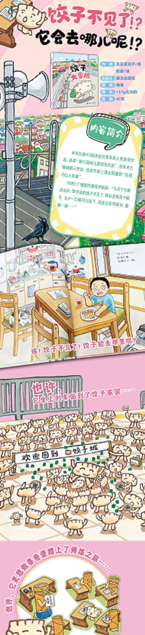 本书为第43届讲谈社绘本新人奖获奖作品,获得“第15届幼儿园绘本大奖”,日本本土畅销新人作品,绘本作家三浦太郎盛赞“狂想力让人叹服”。 叮咚!广播里的播报声响起,“今天下午两点左右,饺子店的饺子不见了,特征是有五个褶子,大小一口就可以吃下。现在正在寻找中。重复一遍……”诶!饺子不见了!饺子能去哪里呢?也许,它坐上列车回到了饺子家园;也许,它更想做春卷便踏上了修炼之旅;也许,它在街上玩滑板却被老鹰叼走了。饺子到底去哪儿了呢?和失踪的饺子一起突破想象的边界,踏上冒险旅程,获得无厘头的快乐。
