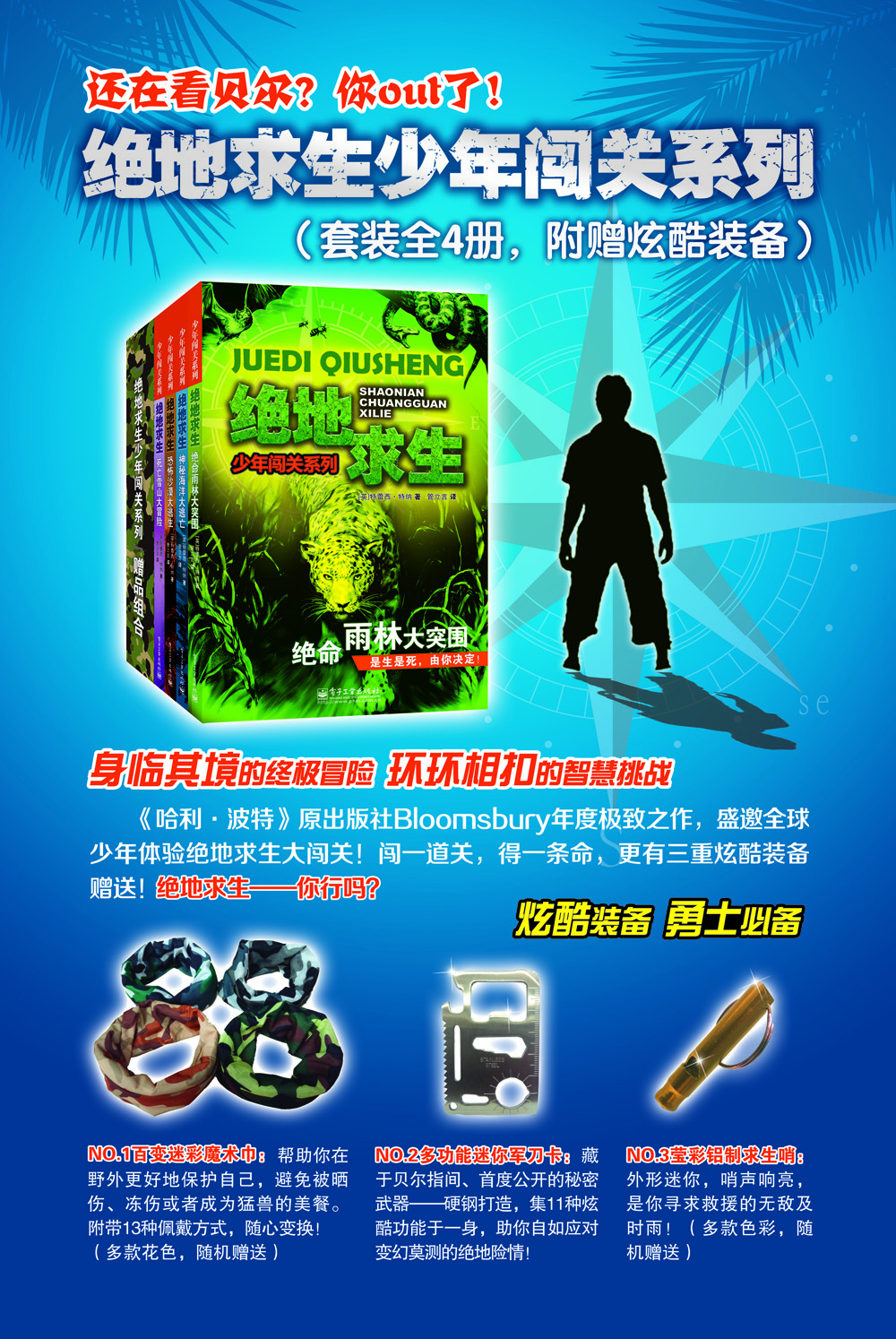 ★超值赠送“绝地小勇士全套求生装备”:NO.1百变迷彩魔术巾;NO.2多功能迷你军刀卡:NO.3莹彩铝制求生哨——炫酷装备,勇士必备!