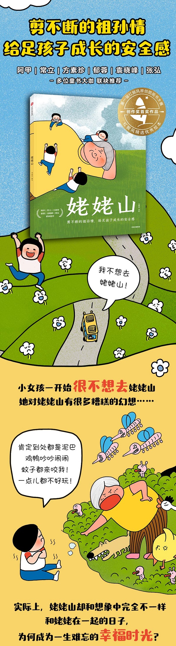 1.红披风图画书大赛首奖作品,阿甲、常立、方素珍、郁蓉、袁晓峰、张弘等多位童书大咖联袂推荐。让人心里一甜的美好故事,让孩子学会感受爱、表达爱。每个人的生命里,都藏着剪不断的祖孙情。老一辈对下一代的关爱和付出,给予孩子成?的温暖和安全。 2充满创意的图文反差,讲述了孩子去姥姥家从讨厌到喜欢的情感转变。看似糟糕的幻想配上愉快的画面,姥姥带来的幸福?个??个的接踵?来:和姥姥一起摘西瓜、捉迷藏,山野也能变成最独特的游乐场;星月闪烁的夜晚,姥姥为我洗衣服,手中盛满月光;姥姥手中轻轻摇动的蒲扇,让我安然进入梦乡……这些童年的一幕幕,都定格为记忆中珍贵美好的图像。 3.扁平漫画风格活泼可爱,带读者开启一段充满梦幻的欢乐旅程。虚实结合的奇特场景,靓丽灿烂的色彩运用,展现一个孩子对姥姥家的梦幻印象,传递孩子的欢乐与喜爱。你的心里也有一座姥姥山吗?在那里,永远有人爱着你,等你回家。愿你心中永远有个充满爱的地方,让你一生都被幸福滋养。