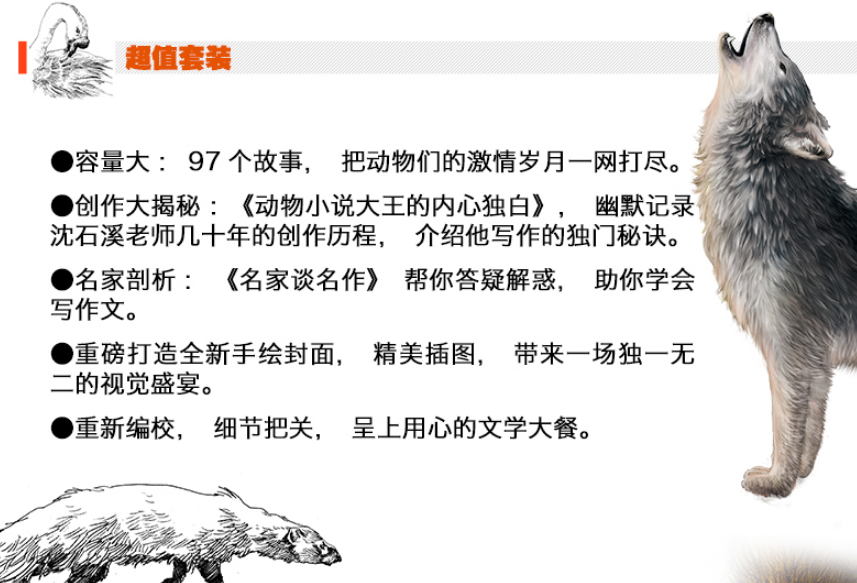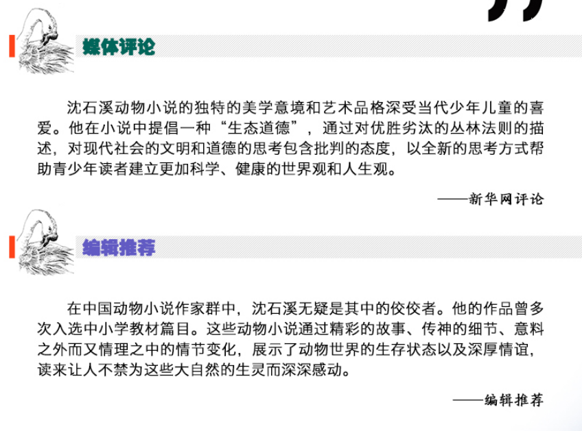 沈石溪的动物小说具有鲜明的文学特点和极具阅读性的故事构思,其对动物的描摹既有自然性的一面,也赋予了一种拟人般的情感,读来酣畅淋漓,非常符合儿童爱恨分明的年龄特征。作为中国首屈一指的动物小说大王,他的作品几乎受到了所有儿童甚至少年的喜爱,非常适合成为童年阅读书单中的重要类型。