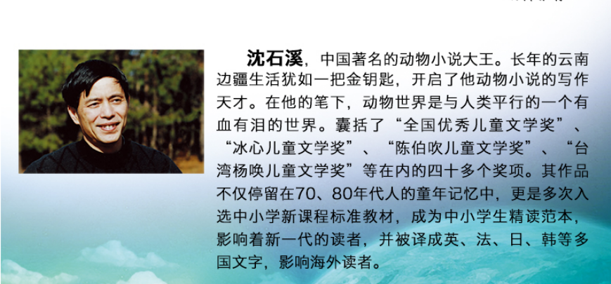 创作以动物小说为主,已出版作品五百多万宇,被称为“中国动物小说大王”。曾获中国作家协会全国优秀儿童文学奖、中国图书奖、冰心儿童文学新作奖大奖、台湾杨唤儿童文学奖等多种奖项。本书精选了沈石溪动物小说中关于豹子的六个中篇小说,通过精彩的故事,传神的细节,意料之外而又情理之中的巧合和变化,全方位展示了豹这一野生动物的种种生存状态,本书令人在感受野生动物世界的艰辛、残酷的同时,更深深地感受它们之间的秩序、正义和温情。