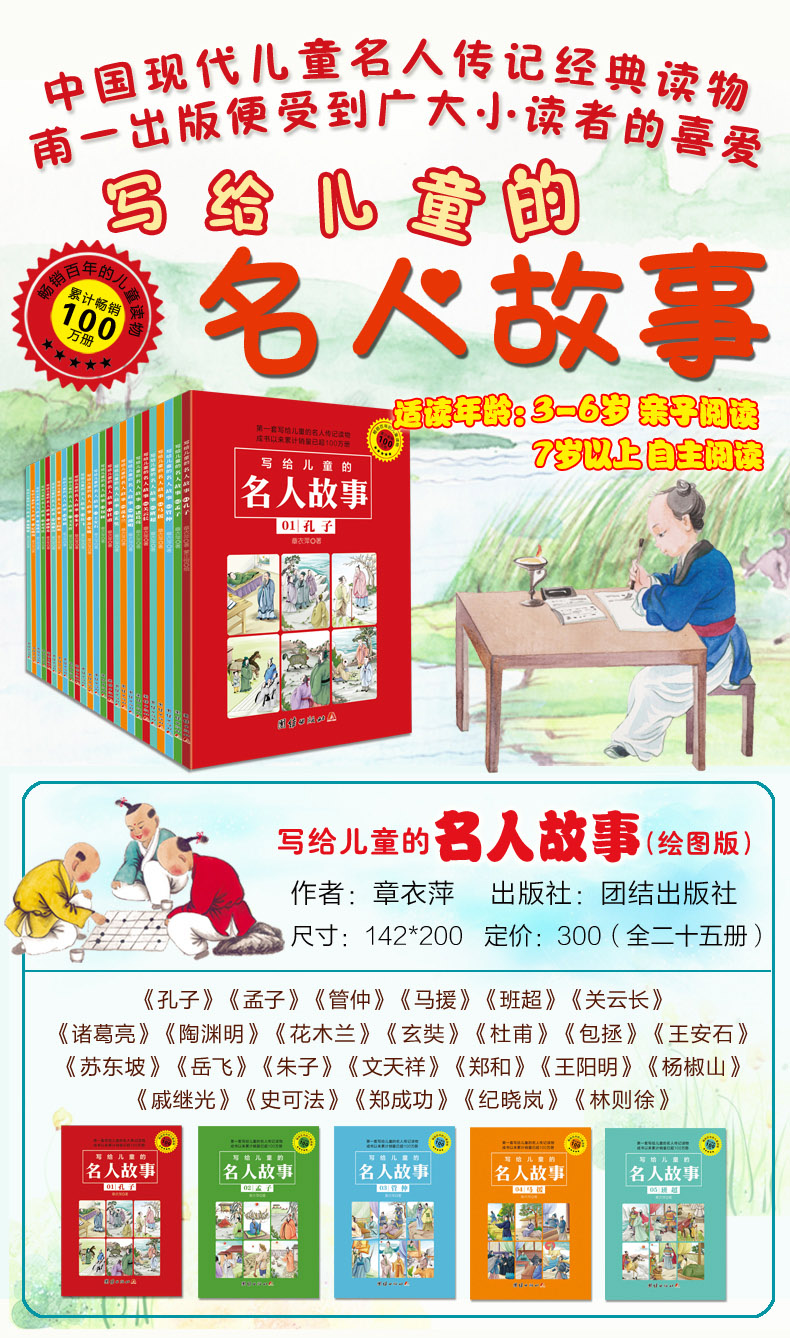《写给儿童的名人故事》原名《中国名人故事丛书》,是章衣萍创作的一套中华民族历史上的大人物的故事丛书,他给小朋友们编写这套书,花了很多的时间和精力,不仅受到小朋友们的喜爱,大人们读来也非常受益。他自己曾说:“无论做什么文章,没有比名人做专记,更使我感动而且麻烦的了。……我平生做文章,很少起草稿的。但这番写中国名人故事,有时竟不能不起草稿,而且再三修改。我为什么要这样小心呢?怕的是唐突古人,贻误少年读者而已。”