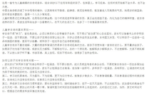 该书为小开本的口袋书,精选出一百五十首适合孩子的古诗,每周安排一首古诗词,含有小学教学大纲全部古诗;著名教育专家尹建莉具体指导孩子学古诗文章,配有精彩插图和复习记忆表。
