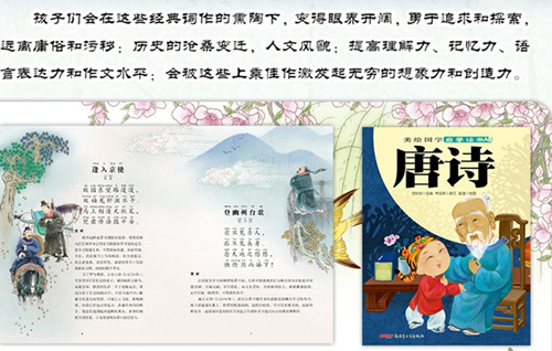 诗词历来是儿童启蒙教育的*教材。唐诗代表着我国古典诗歌的发展*峰,每一首诗都凝结着古人的智慧,是孩子们不可不读的佳作。 他们会在这些佳作的熏染下,变得眼界开阔,志存高远,勇于追求和探索,脱离粗俗与污秽;会在诵读这些**词作的过程中了解历史的沧桑变迁,了解社会的各种人文风貌;会在诵读这些**词作的过程中,积累越来越多的词汇,提高理解力、记忆力、语言表达力和作文水平;会被这些上乘佳作激发起无穷的想象力和创造力。