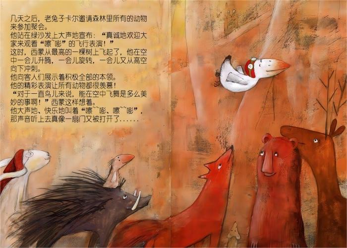 在一次学飞的过程中,西蒙曾摔到地上,并发出“嚓-嘭”的声音。从此,西蒙虽然会飞了,却永远只会说“嚓-嘭”这两个字,西蒙为此感到十分沮丧。一只年老的兔子看到他这样,想要帮助他。他发现西蒙其实飞得很棒,所以他给西蒙举行了飞行表演。从此以后,西蒙虽然仍然只会说“嚓-嘭”,但自信却重新回到了他身上。也许,挫折会造成人心理上的阴影。但是,只要相信自己就一定会成功。本书是奥地利图画书创作“金牌组合”的又一力作, 他们曾荣获奥地利青少年图书奖及维也纳青少年图书奖。