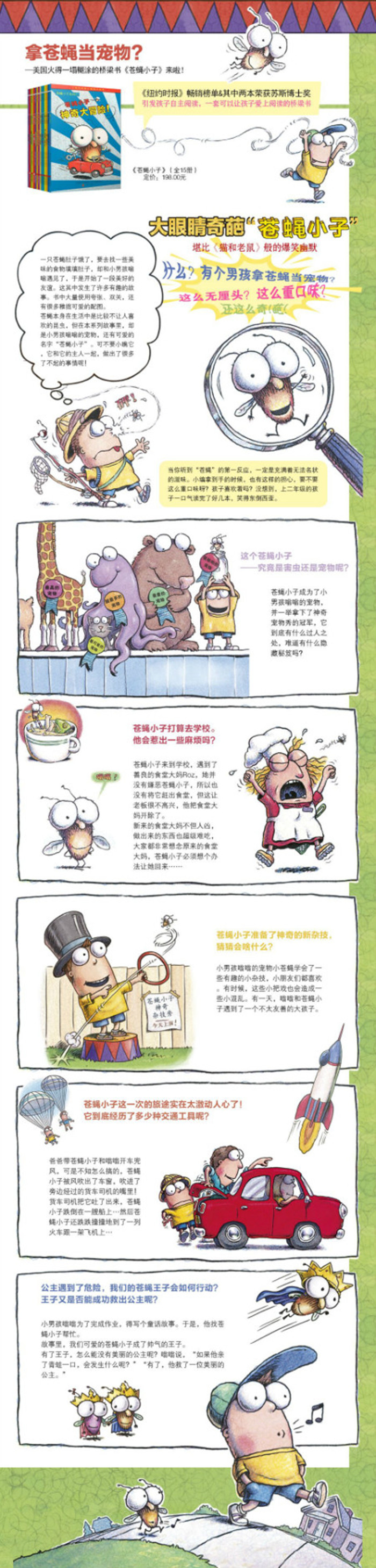 《苍蝇小子》系列是由作家泰德·阿诺德创作的儿童幽默故事系列,以简单的章节读物形式向小朋友讲述一个又一个幽默搞笑的故事。系列中《你好!苍蝇小子》和《苍蝇小子,我找到你了!》曾荣获美国图书馆协会童书大奖“苏斯博士奖”。在故事中,一只苍蝇肚子饿了,要去找一些美味的食物填满肚子,却和小男孩嗡嗡遇见了,于是开始了一段美好的友谊,这其中发生了许多有趣的故事。因为故事的趣味性和画风的幽默,孩子一读就停不下来,特别适合用来培养孩子独立阅读的习惯,成为全球公认的经典桥梁书之一,是孩子从绘本过渡到独立阅读章节小说更好的选择。