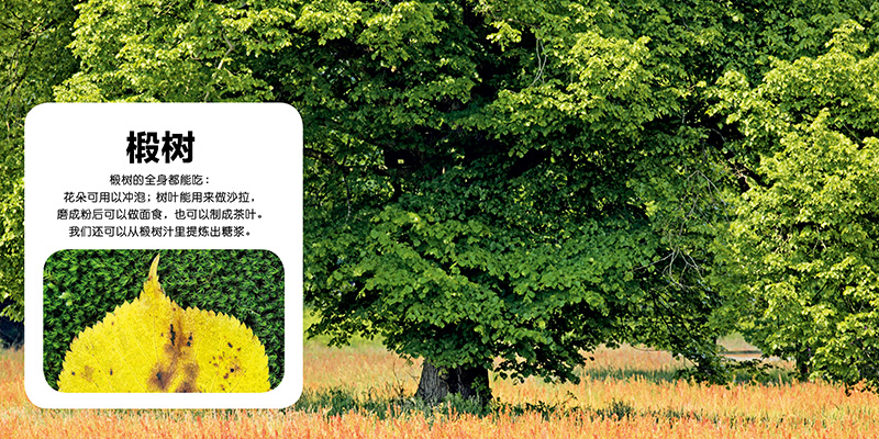对低龄儿童来说,认识树木、区分树叶并不是一件容易的事,但当我们用一种愉快的方式展开,就会变得简单多了!每张跨页上都展示一种树的全景照片,旁边配有一个小方框,指出这种树的树名,并附有一张这种树树叶的照片,以及一则简短的关于这种树的外观、生长环境、用途和独特性的介绍。