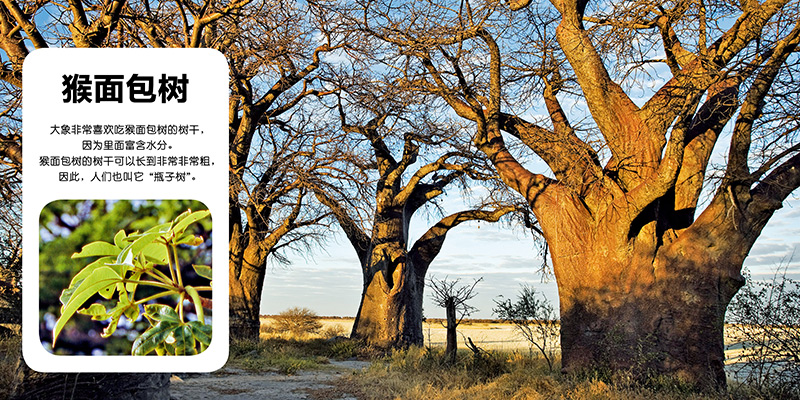 “大象非常喜欢吃猴面包树的树干,因为里面富含水分。猴面包树的树干可以长到非常非常粗,因此,人们也叫它‘瓶子树’。”