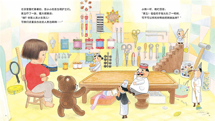 在佳佳与小熊的神奇之旅中,妈妈貌似是缺席的,但最后一页清楚明白地表明,是妈妈帮佳佳拔了刺、给小熊缝合开线的手臂,玩具医院则是妈妈的缝纫盒。