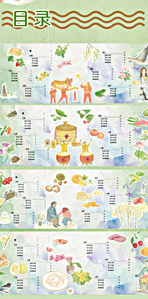 二十四节气的原创科普图画书,包括节气概说、动植物、传统习俗、节气故事等板块,通过古朴淡雅的中国风格图画和充满诗意的语言,讲述二十四节气这项古老而伟大的中国发明的历史由来以及它对人们生产生活带来的影响。二十四节气是伟大的中国人民献给全世界的智慧结晶。本书用真实的图画描绘出孩子们不常见的中国传统街市、庭院和四季变迁的大地,展现出自然界的魅力和农业、农村的趣味;融合精彩的中国传统故事、习俗节日、时令谚语以及动植物候,让孩子们感受传统文化和自然科学之美,每个节气都包含节气由来、节气物候、节气谚语、传统民俗、节气诗词、农事活动等多个板块内容,囊括古诗词、节气歌、谚语,立体式呈现一套孩子们能真正参与互动的二十四节气绘本,成为中华优秀传统文化启蒙和自然科学教育的精品读物,通过一段段生动活泼的文字和一幅幅美丽而又有浓郁传统风格的图画,揭示了自然界的魅力和农业的趣味,让小朋友对一年里的季节特点和农事安排了然于心。