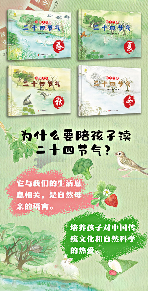 二十四节气的原创科普图画书,包括节气概说、动植物、传统习俗、节气故事等板块,通过古朴淡雅的中国风格图画和充满诗意的语言,讲述二十四节气这项古老而伟大的中国发明的历史由来以及它对人们生产生活带来的影响。二十四节气是伟大的中国人民献给全世界的智慧结晶。本书用真实的图画描绘出孩子们不常见的中国传统街市、庭院和四季变迁的大地,展现出自然界的魅力和农业、农村的趣味;融合精彩的中国传统故事、习俗节日、时令谚语以及动植物候,让孩子们感受传统文化和自然科学之美,每个节气都包含节气由来、节气物候、节气谚语、传统民俗、节气诗词、农事活动等多个板块内容,囊括古诗词、节气歌、谚语,立体式呈现一套孩子们能真正参与互动的二十四节气绘本,成为中华优秀传统文化启蒙和自然科学教育的精品读物,通过一段段生动活泼的文字和一幅幅美丽而又有浓郁传统风格的图画,揭示了自然界的魅力和农业的趣味,让小朋友对一年里的季节特点和农事安排了然于心。