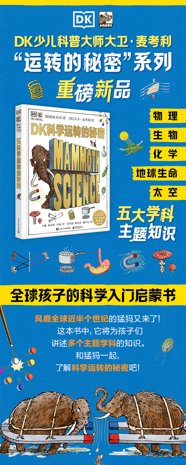 《DK科学运转的秘》是DK少儿科普畅销作家大卫·麦考利的科普童书系列,继《DK万物运转的秘密》、《DK机械运转的秘密》之后的第三本全球热销科普童书。 从原子内部到太阳系甚至更远的地方,猛犸象都在寻求理解科学,并带领孩子们学习物理、生物、化学和地球科学的基础知识。为什么物体会漂浮?活细胞里有什么?磁铁是如何工作的?猛犸象有多重? 《DK科学运转的秘》覆盖了60多个核心科学主题,以清晰的解释性文字和支持性图表,生动的解释了这些科普主题,和猛犸象一起,了解科学运转的秘密吧!
