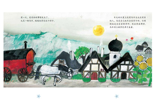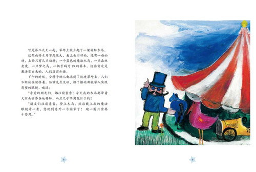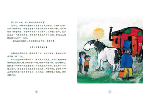 有一天,大胡子伍兹先生坐着它的红色马车来到村子里,全村的人都对这个陌生的马车好奇极了,整天围着它看。一天清晨,马车竟然不见了,代替它的是旋转木马。骑上蓝色的魔法木马,小孩都能飞到天上去……