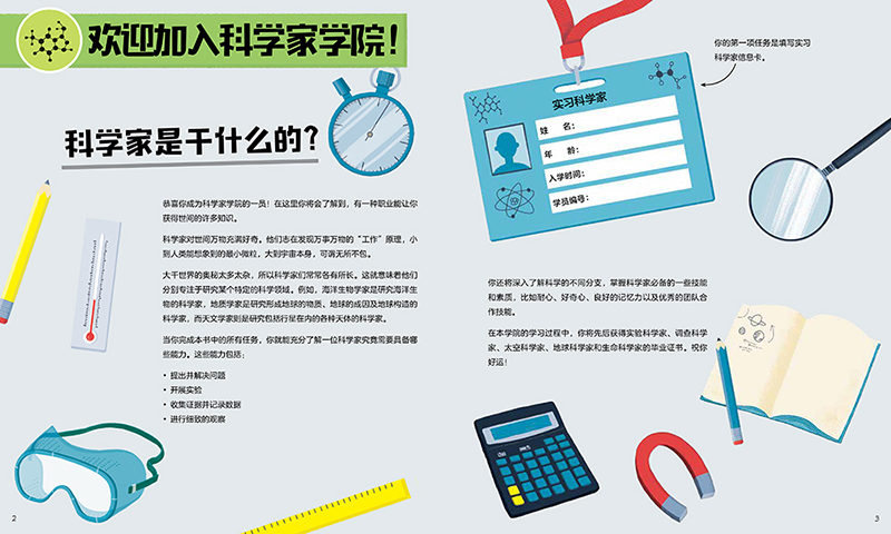 你喜欢做实验、搞测试、进行发明创造吗?如果你的回答是“喜欢”,就快来报名加入科学家学院吧。在这里,你不仅能认识许多著名科学家,还能学会记录自己的心率、计算你在火星上的年龄、设计化学实验并掌握很多其他技能。本书包含种类繁多的实验活动、技能测试、趣味游戏和可爱贴纸,是一本培养未来的生物学家、化学家与物理学家的完美手册。还等什么?快戴上护目镜,穿上工作服,准备好进行科学探索吧!