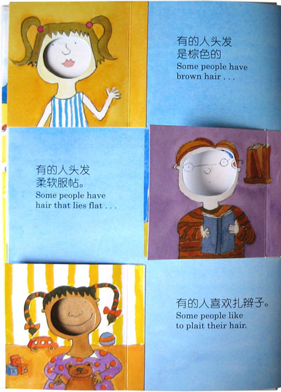 最吸引人的是这套书的“立体”性,每一页翻开都有各种立体的图案,或是可以移动的图案。随着书页的开合、手指的推拉、旋转,可以看到人、物的动作或是不同的内容,非常有趣。看书的过程充满了探索的乐趣,既鼓励了孩子们的阅读热情又可以让他们自己动手参与。 其次,这套书很好地为孩子们介绍了我们所生活的世界,既有建筑、汽车等与生活相关的物体,又有身体、人等与人有关的部分,还有感觉、害怕等这样的难以触摸的情绪。在书中,作者绘制了各个人种的孩子的形象,本书似乎很有“地球村”的感觉,让孩子可以在书中感受更广阔的世界。