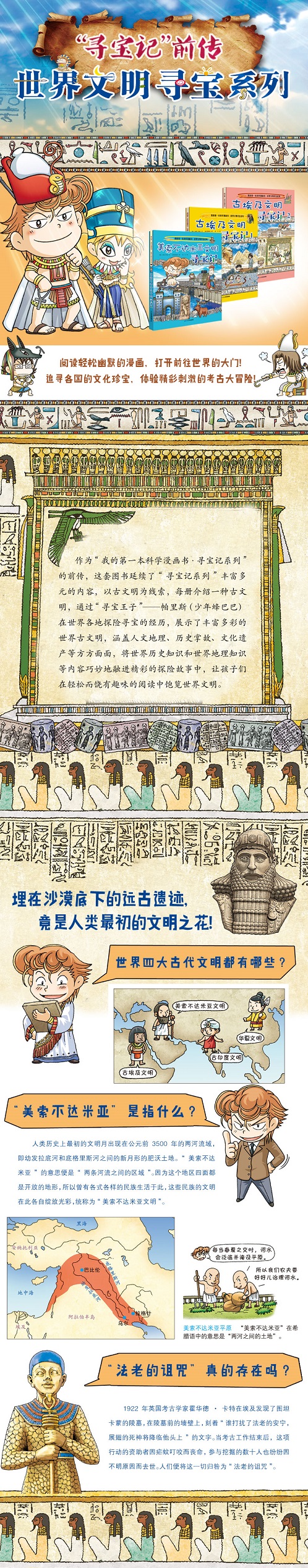“我的第一本科学漫画书·世界文明寻宝系列”是一套从韩国著名的大韩教科书出版社引进的大型人文历史漫画书,集聚了韩国一流知识漫画创作团队的经典之作。作为“我的第一本科学漫画书·寻宝记系列”的前传,这套图书延续了“寻宝记系列”丰富多元的内容,以古文明为线索,每册介绍一种古文明,通过“寻宝王子”——帕里斯(少年峰巴巴)在世界各地探险寻宝的经历,展示了丰富多彩的世界古文明,涵盖人文地理、历史掌故、文化遗产等方方面面,将世界历史知识和世界地理知识等内容巧妙地融进精彩的探险故事中,让孩子们在轻松而饶有趣味的阅读中饱览世界文明。本书在每个章节后,均附有简明的古文明概况,由浅入深,拓展孩子们的阅读视野。