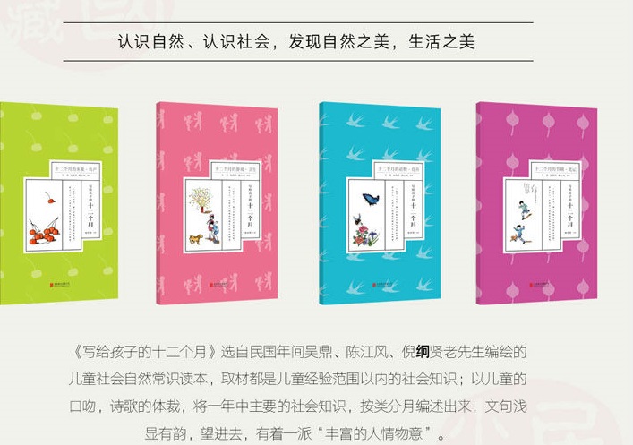 春耕、夏耘、秋收、冬藏。一年十二个月,每月都有不同的风景。本套书选自民国年间吴鼎、陈江风、倪?贤老先生编绘的儿童社会自然常识读本,取材都是儿童经验范围以内的社会知识;以儿童的口吻,诗歌的体裁,将一年中主要的社会知识,按类分月编述出来,文句浅显有韵,望进去,有着一派“丰富的人情物意”。我们希望意通过这套精美别致的小册子,引导孩子感受物候的变化,自然的美妙,感受地道的中国美学。