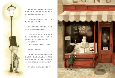 因为,在儿童的生活经验和想象中,克丽奥帕特拉就应该是这样的。《雾都孤儿》调性灰暗又不乏温暖,因为所有的现实主义在儿童的眼里都是浪漫主义(狄更斯怎能例外?)。在《白牙》中,绘者大胆选用简洁线条和大色块相互衬托的方式,强烈的对比反差表现了寒带高原自然生活的本质和精神。绘者超凡的想象力和表现力还体现在画面的细部处理上:《白牙》的封面故意在狼的头部和脊梁上绘出寒带的针叶林,与狼毛浑然一体,体现了动物与自然的和谐统一,而计白当黑的狼的眼神设计则表现了狼对人类的复杂情感;《埃及女王》用贴纸的描绘形式表现人物之间的关系,这无疑会使孩子在品尝这道视觉盛宴时大快朵颐;你也能看明白《雾都孤儿》那只被锁进笼子的小白兔是奥利弗被关禁闭的心情的投射,可当你看到奥利弗爬到一只怀表上,那又是什么寓意呢?让孩子来告诉你吧……这些情节和画面的设计都超乎我们成人对经典本身的认知和想象,但却无限接近孩子的世界,孩子们通过对一幅幅新奇的画面和一段段简洁的文字的“悦”读,以他们自己的经验“翻译”出原创者们设置的层层玄机,加上自己的理解和想象,如此完成了对经典的个性化解读,甚至再创造。