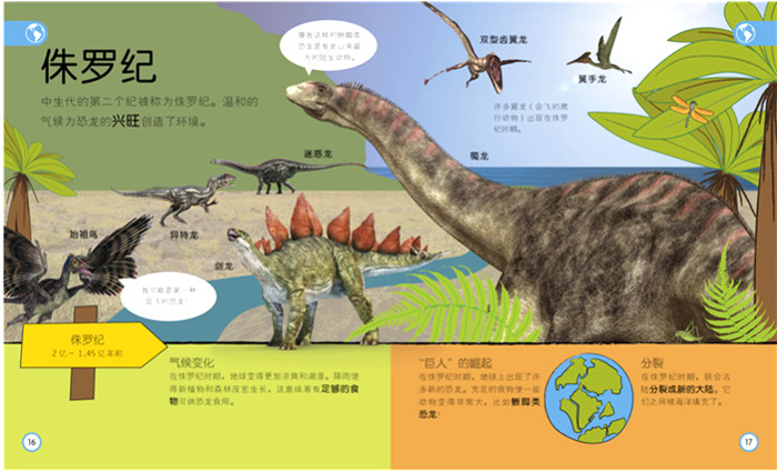 这是一本能够带你重返史前世界的书。在这里你可以了解各种化石,近距离观察腕龙的骨骼,以及发现更多不可思议的恐龙。这本令人兴奋的幼儿百科里充满了最新的发现和研究成果,深入探索了三叠纪、侏罗纪、白垩纪。它告诉我们化石的形成过程,详细描述了一些非常受欢迎的恐龙,如暴龙、三角龙、剑龙,还有一些不同寻常的种类,如小盗龙、冠龙和棘龙。