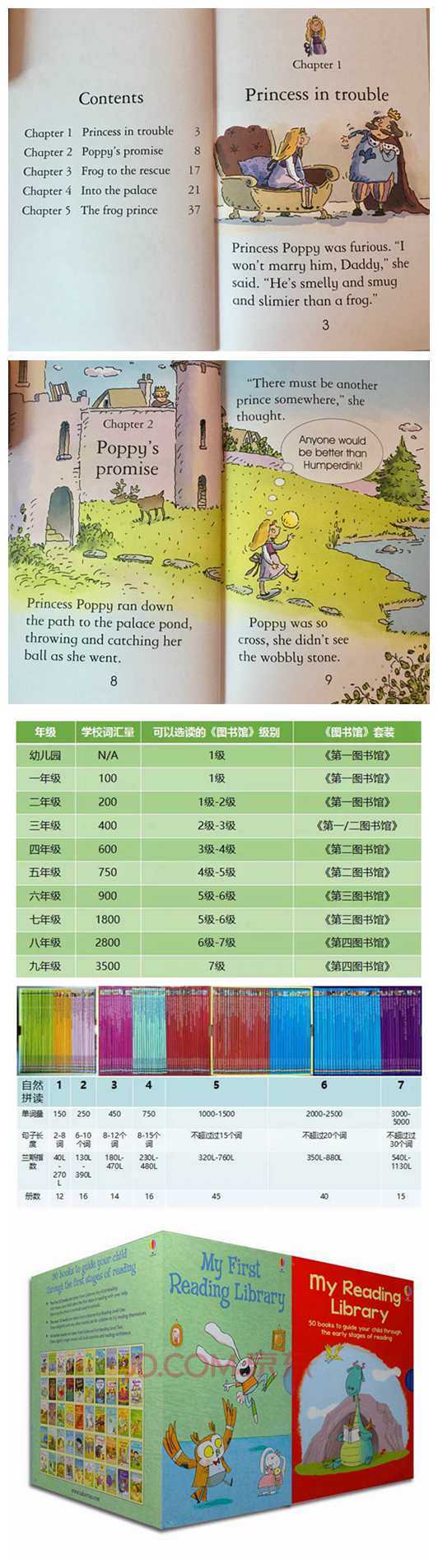 USBORNE图书馆系列到LEVEL5之后,词汇量增加到1000-1500,每页的文字数量在十行左右,共48页,涵盖了英文大部分的语态和时态。从这个级别开始,由图画书逐渐过渡到章节阅读。适合小学五六年级和初中生作为词汇量扩展读本。Level5系列均为世界知名的民间故事和童话故事,学生一般都已接触过中文版本。