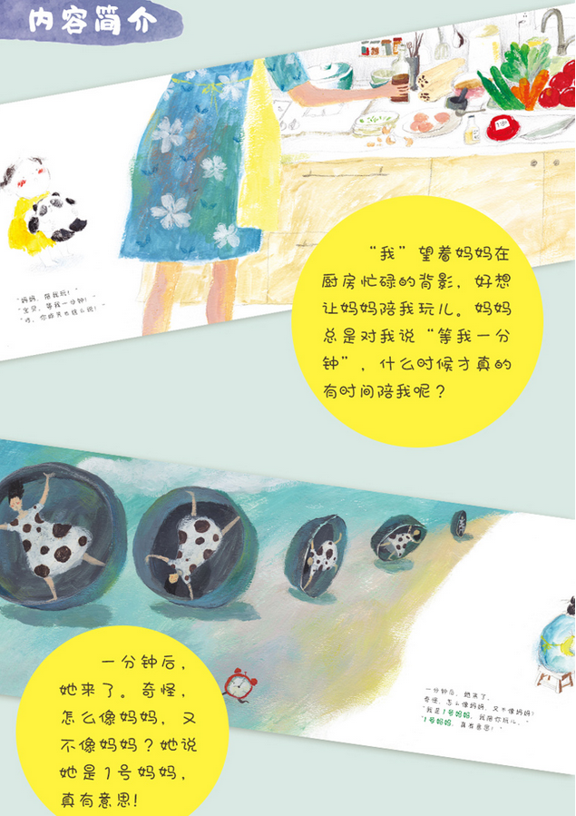 这是一个关于“我”和“妈妈”的故事:“我”望着妈妈在厨房忙碌的背影,好想让妈妈陪我玩儿。妈妈总是对我说“等我一分钟”,什么时候才真的有时间陪我呢?一分钟后,她来了。奇怪,怎么像妈妈,又不像妈妈?她说她是1号妈妈,真有意思!1号妈妈陪我玩泡泡,2号妈妈陪我跳绳……9号妈妈和我像鸟儿一样在天空翱翔,10号妈妈带我到了月球……*后,12号妈妈闪亮登场。到底谁才是我真正的妈妈呢?这个故事是一个孩子天真烂漫的童年想象,亦是现实世界中母子关系的生动写照,将母子间的暖人情感表现得淋漓尽致;通过轻松有趣的想象,架设起孩子与父母之间相互理解的桥梁,有利于更包容、更多元的亲子关系,是妈妈和孩子不可缺少的亲子共读之书。