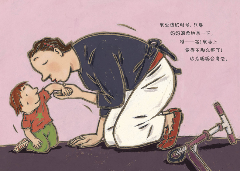 “我的一家”系列包括《我的爸爸是巨人》《我的妈妈会魔法》《我的爷爷是冠军》《我的奶奶是明星》四本,以孩子的口吻列举日常生活中发生在家人身上的事,运用了夸张的手法展现了儿童眼中的家人形象,表达了孩子对于长辈的崇拜和爱,同时通过孩子的叙述,长辈对于孩子的呵护和关爱也流露出来,图画书整体呈现出温馨友爱的氛围。配合文字表达的内容,图画的构图简洁,线条稚拙流畅,画面色彩艳丽明亮,符合儿童的审美趣味。
