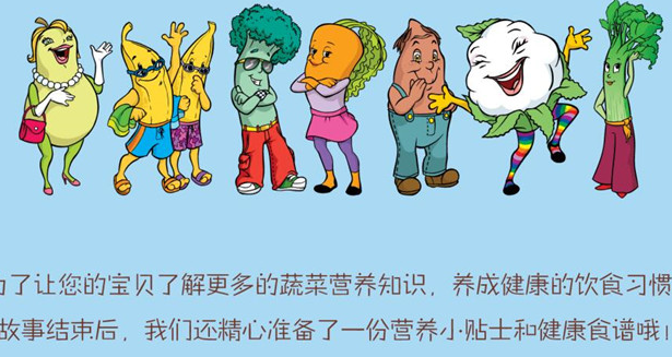 事实的确如此。以笔者的孩子们为例,这类寓健康饮食理念于蔬果主人公的故事,他们听得津津有味,这对他们婴童期的成长和以后的健康饮食观念也产生了深远的影响。可以说,正是对故事中角色的认同让他们逐步养成了健康饮食的好习惯。