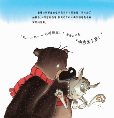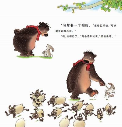 大熊道格拉斯想要一个温暖的拥抱。他不断尝试着,他拥抱了大大的石头、高高的树木、软软的叶子,但是感觉都不对。小兔子带着他去寻找拥抱。其实,对道格拉斯来说,最好的抱抱当然是来自自己的妈妈啦!这本书折射出温暖的母爱无可比拟。