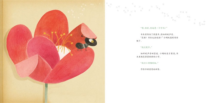 王一梅童书•精装绘本是 “王一梅童书”品牌的全新子系列,包括《书本里的蚂蚁》《胡萝卜先生的长胡子》《鼹鼠的月亮河》《木偶的森林》四册,邀请到阿根廷、立陶宛的获奖插画师与两位国内一线插画师分别绘制四本书的封面及插图,以独特的色彩与构图,将具有王一梅典型风格的、温馨且意味深长的童话情节完美展现,为作品增添了更加鲜活、更具生命力的童趣,贴近当代儿童的审美,具有国际化的美育标准。 同名短篇童话《书本里的蚂蚁》曾入选《新语文读本》、获中国作家协会第五届全国优秀儿童文学奖,讲述了一只偷偷爬进图画书中的小蚂蚁与小女孩共同畅游书本中的世界的故事。在还原原本故事情节的基础上,绘本中增添了小女孩通过每天阅读不同的故事、在森林、海洋、太空等不同的场景畅游的场景设计,趣味生动,使儿童能够直观地感受到阅读所带来的快乐,同时,阿根廷插画师塞西莉亚•瓦雷拉运用独有的“剪贴”手法,将故事中的书本“实物化”,视觉效果极富冲击力,使小读者仿佛真的和故事中的女孩一起钻到了书本里,沉浸在作者营造的故事氛围中。