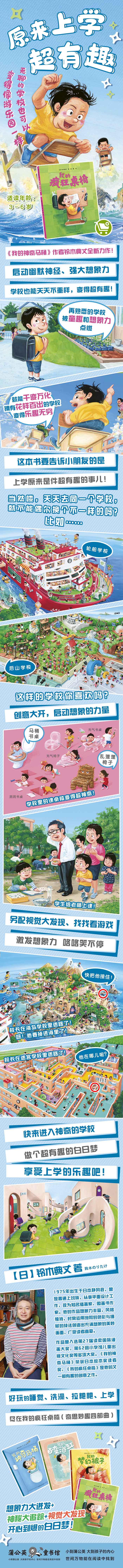 这本书告诉小朋友的是——上学原来是件超好玩的事儿! 哦,是吗?那么无聊的事儿有什么好玩儿的呢? 当然喽,天天去同一个学校,就不能偶尔换个不一样的吗?比如说门口有一道瀑布的瀑布学校,这样就可以天天打伞啦;比如说替身书桌,这样就可以不用做作业了。还有神奇的透明书桌、飞天椅子、章鱼椅子……咦?学生正在给校长上课,可校长突然不见了,这该怎么办? 想象力无敌,开心到爆,还有神秘大追踪,视觉大发现!快来一起进入神奇的学校世界,做个超有趣的白日梦吧!