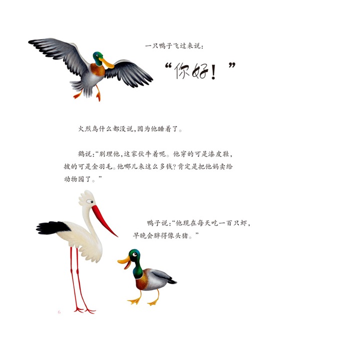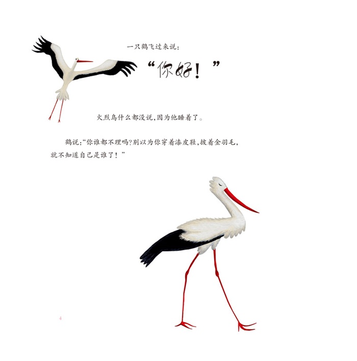 故事一开始,鹤问候了火烈鸟,却看不出火烈鸟睡着了,火烈鸟的不理睬让鹤小小的心灵受了伤——对方不友好,这既然不是自己的错,那么就只能是对方的错。看待事情的方式,决定了如何去想象。于是,火烈鸟在鹤的想象中成了“不知道自己是谁”的骄傲的怪物。于是,火烈鸟在像鹤一样觉得自己受到伤害的鸟儿们的想象中,只能越变越可怕。火烈鸟没有恶意,它只是睡着了,这不是明摆着的吗?事实是,没有什么是明摆着的,理解并非易事,毕竟,每一个人就是别有天地的一个小世界。因为不理解,所以不知道,因为不知道,所以会害怕。 ——导读节选
