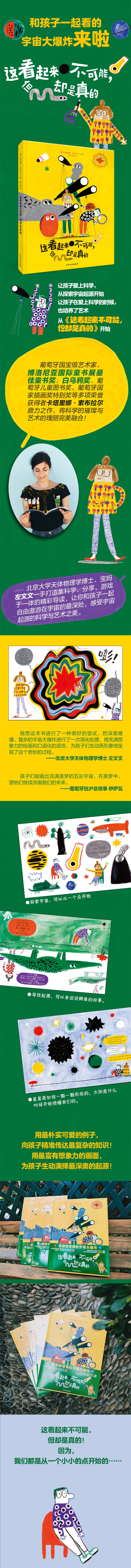 本书从世界万物起源于一个小小的点开始,结合各种生活中的常见场景与事物,从孩子们熟悉的角度切入,生动有趣地描述了宇宙诞生的过程。期间多次与标题呼应,以“这看起来不可能/这听起来不可能/这不可能,但……”等用语与孩子们的直观感受相呼应,从孩子们的视角与理解力出发,向孩子们形象而优美地展现了宇宙的诞生过程、传达了基本粒子(书中的“小不点”们)是世界万物的组成基础的科学概念。 全书*后落笔于宇宙的*深处,将全书的科学内涵与人文感悟提升到了一个新的高度。同时附录中的科学词汇表,也能很好地拓展了孩子的天文学知识,并进一步激发他/她们对广阔世界的好奇心与学习热情。