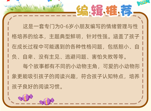 这是一套专门为0-6岁小朋友编写的情绪管理与性格培养的绘本,主题典型鲜明,针对性强。涵盖了孩子在成长过程中可能遇到的各种性格问题,包括胆小、自负、自卑、没有主见、逃避问题、害怕失败等等。 每个故事都有不同的小动物主角,可爱的小动物形象更能吸引孩子的阅兴趣,符合孩子认知特点,培养孩子良好的阅读习惯。