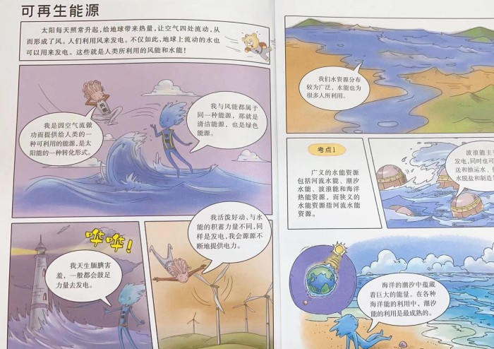 太阳每天照常升起,给地球带来热量,让空气四处流动,从而形成了风。人们利用风来发电。不仅如此,地球上流动的水也可以用来发电。这些就是人类所利用的风能和水能!