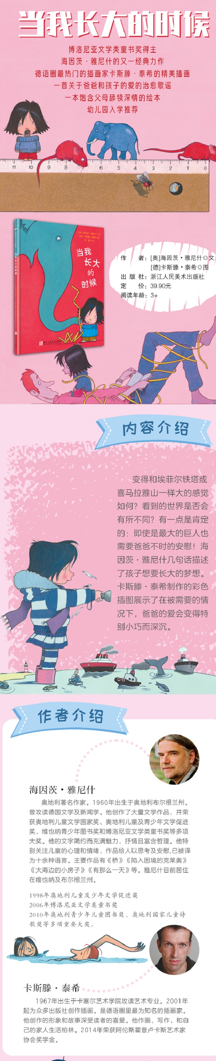 封面显示一个深色头发的小女孩手里拿着一把尺子,还有一个强大的大笨象的头。这就是这本图画书的重点:大小游戏。在越来越多的梦幻般的场景,还有之前多么伟大的事物,然后由女孩到父亲。海因茨·雅尼什用幽默来给这本书*终加冕。孩子们将被主题迷住了,并立即对此产生更大更多的想法。卡斯滕泰希的插图色彩丰富,使绘本乐趣无穷。——青少年图书馆
